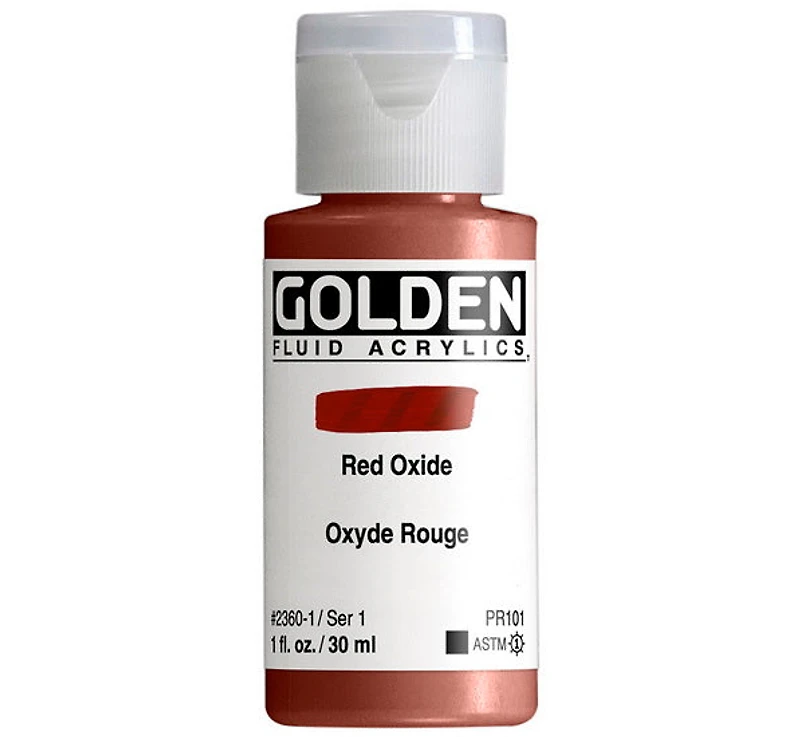 Equal the intensity of GOLDEN Heavy Body Acrylics, but with an even, flowing characteristic useful for fine brushwork, glazing, staining, water media techniques, and much more. You can mix Fluid Acrylics with GOLDEN Airbrush Medium for airbrush application of artwork including textiles. They blend easily with all acrylic colours, and readily tint gels, mediums, gessoes and grounds.  GOLDEN Fluid Acrylics are created by loading an acrylic polymer binder with concentrated levels of quality pigments for a wide selection of permanent and lightfast colours. No fillers or extenders are added to achieve the desired consistency, nor is the fluid quality achieved with additional water. GOLDEN Fluid Acrylics have the same pigment load as GOLDEN Heavy Body Acrylics, but in a viscosity similar to heavy cream. Fluids Acrylics allow for smooth flowing applications, while retaining colour intensity, tinting strength, film integrity and adhesion.