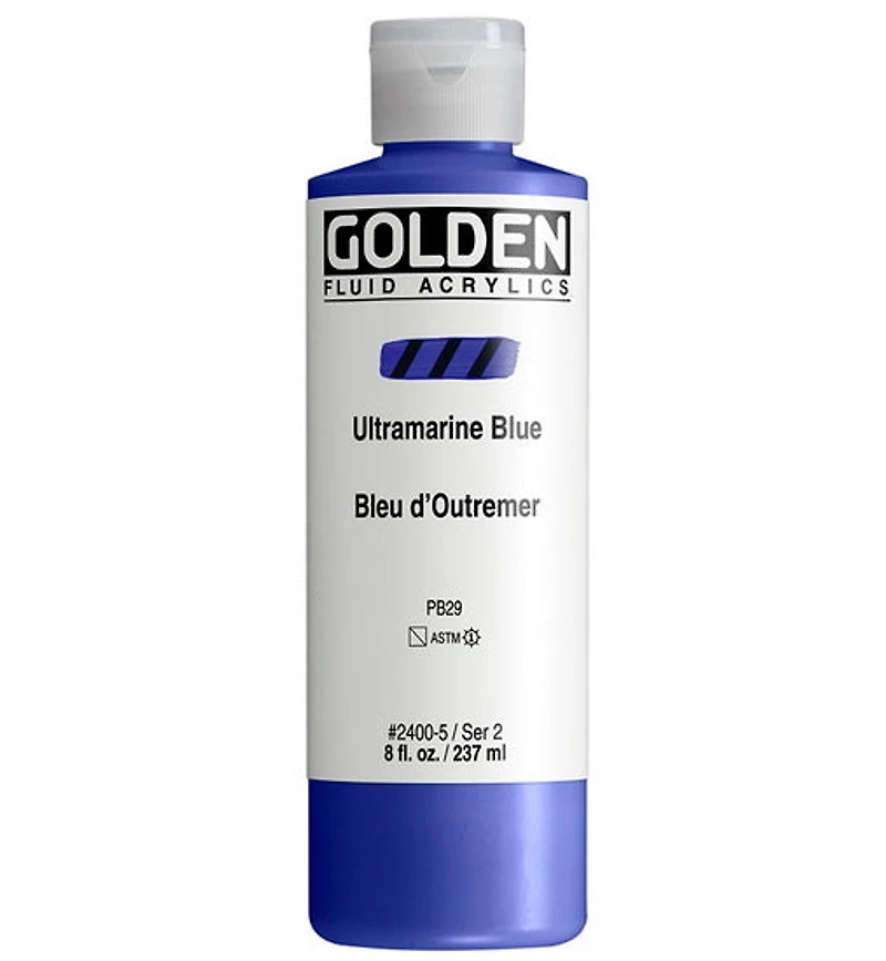 GOLDEN Fluid Acrylics are created by loading an acrylic polymer binder with concentrated levels of quality pigments for a wide selection of permanent and lightfast colours. No fillers or extenders are added to achieve the desired consistency, nor is the fluid quality achieved with additional water. GOLDEN Fluid Acrylics have the same pigment load as GOLDEN Heavy Body Acrylics, but in a viscosity similar to heavy cream. Fluids Acrylics allow for smooth flowing applications, while retaining colour intensity, tinting strength, film integrity and adhesion.