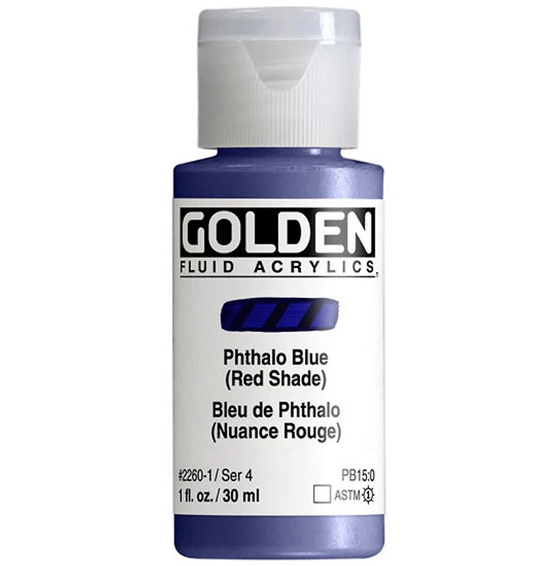 GOLDEN Fluid Acrylics are created by loading an acrylic polymer binder with concentrated levels of quality pigments for a wide selection of permanent and lightfast colours. No fillers or extenders are added to achieve the desired consistency, nor is the fluid quality achieved with additional water. GOLDEN Fluid Acrylics have the same pigment load as GOLDEN Heavy Body Acrylics, but in a viscosity similar to heavy cream. Fluids Acrylics allow for smooth flowing applications, while retaining colour intensity, tinting strength, film integrity and adhesion.