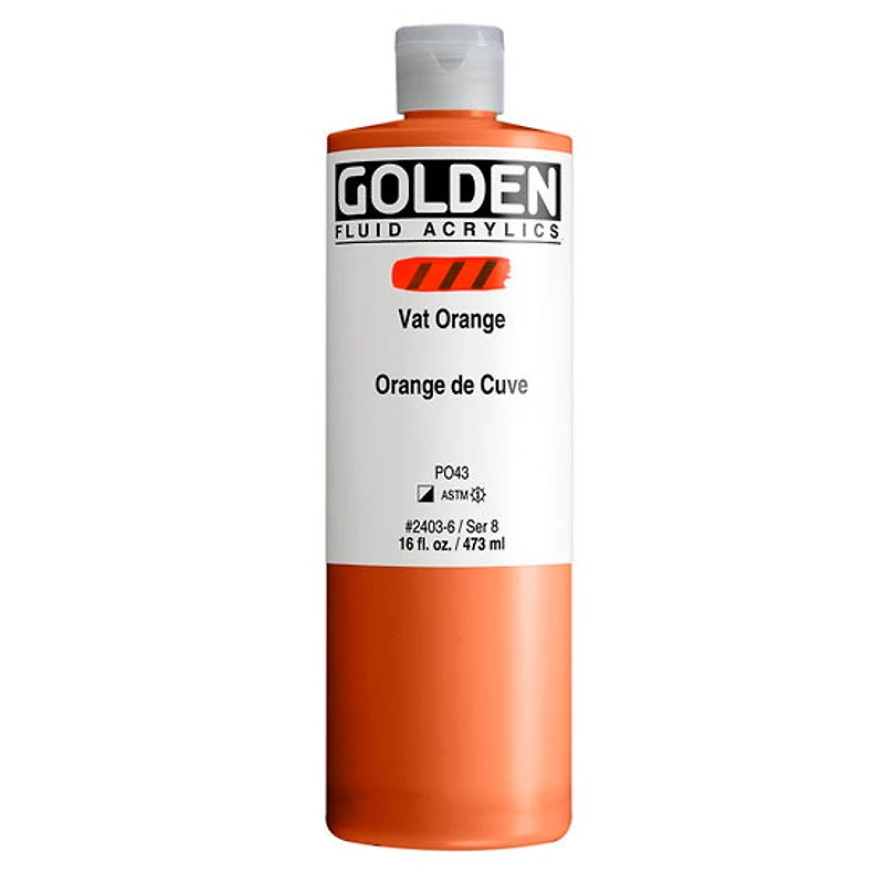 Equal the intensity of GOLDEN Heavy Body Acrylics, but with an even, flowing characteristic useful for fine brushwork, glazing, staining, water media techniques, and much more. You can mix Fluid Acrylics with GOLDEN Airbrush Medium for airbrush application of artwork including textiles. They blend easily with all acrylic colours, and readily tint gels, mediums, gessoes and grounds.  GOLDEN Fluid Acrylics are created by loading an acrylic polymer binder with concentrated levels of quality pigments for a wide selection of permanent and lightfast colours. No fillers or extenders are added to achieve the desired consistency, nor is the fluid quality achieved with additional water. GOLDEN Fluid Acrylics have the same pigment load as GOLDEN Heavy Body Acrylics, but in a viscosity similar to heavy cream. Fluids Acrylics allow for smooth flowing applications, while retaining colour intensity, tinting strength, film integrity and adhesion.