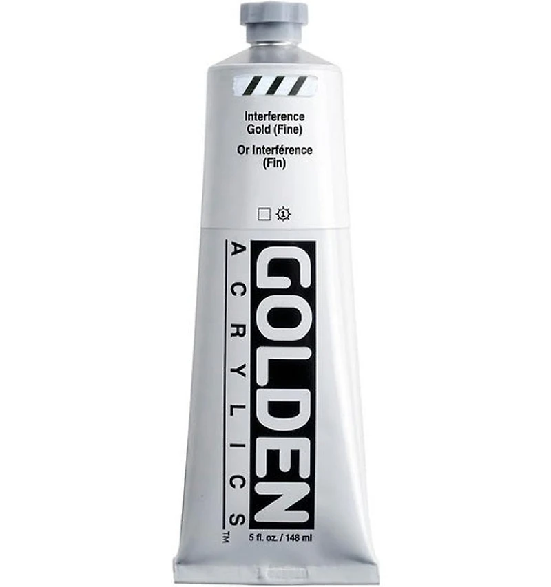 Add brilliance and sophistication to your artwork with Golden Heavy Body Interference Gold (Fine) Acrylic (5?oz). This special hue features iridescent golden reflections that shift with the light, providing a subtle, dynamic glow that enhances your creations with a precious, luminous touch.