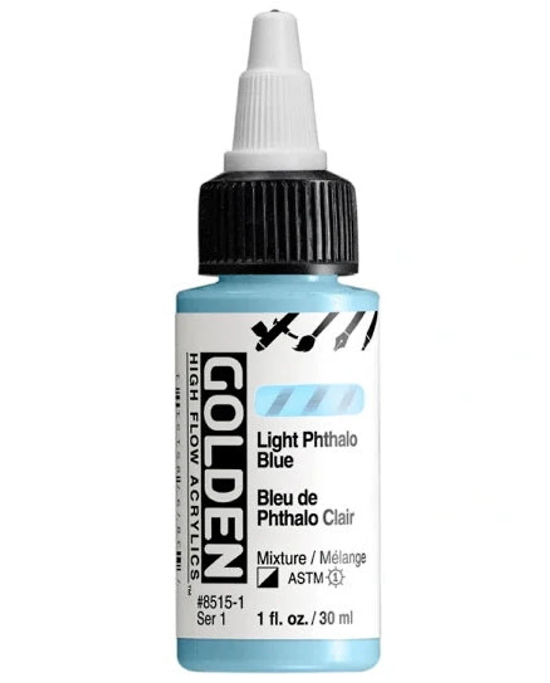 Bring vivid, intense color to your creations with Golden High Flow Acrylic Paint – Light Phthalo Blue (30 ml / 1 oz, S1). This warm, rich light blue is perfect for landscape artists looking to create large, uniform areas, such as a sky or ocean, with smooth, even coverage.