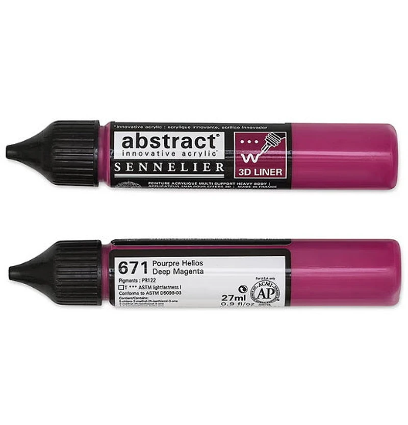 Abstract Liner Acrylic Markers feature a precision applicator, making them ideal for 3D relief, contour effects and precise line work. Their squeeze tube design allows you to apply paint directly onto your surface with ease—plus, the tubes are transparent so you can clearly see what your colour will look like without having to squeeze it out onto a palette first. Their transparent design is also great for knowing how much paint you have left, and once the tube is empty, it can easily be refilled with Sennelier Abstract Acrylic Paints. Suitable for a variety of surfaces, they come in 20 beautiful colours. A great addition to any painter's studio!Can hold up to 27 ml of paint.