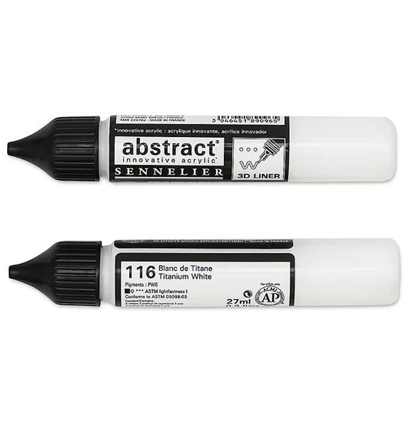 Abstract Liner Acrylic Markers feature a precision applicator, making them ideal for 3D relief, contour effects and precise line work. Their squeeze tube design allows you to apply paint directly onto your surface with ease—plus, the tubes are transparent so you can clearly see what your colour will look like without having to squeeze it out onto a palette first. Their transparent design is also great for knowing how much paint you have left, and once the tube is empty, it can easily be refilled with Sennelier Abstract Acrylic Paints. Suitable for a variety of surfaces, they come in 20 beautiful colours. A great addition to any painter's studio!Can hold up to 27 ml of paint.