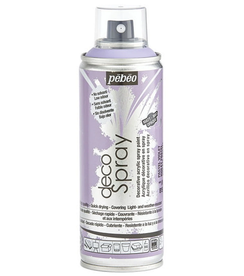 Designed for use on most surfaces, Pebeo Spray is a water-based (except Chrome colours) acrylic spray paint with a unique composition that combines very low-odour hydro soluble resins with very high-quality pigments. Solvents have been replaced by a water-based mixture, which allows for a slightly longer drying time than solvent-based spray paints, and results in a low odour, multi-surface paint (except in Chrome colours). The colours are permanent and opaque, and are available in a variety of effects: mat, glossy, fluorescent, pearl, glitter, chrome, chalk, chalkboard, granite.