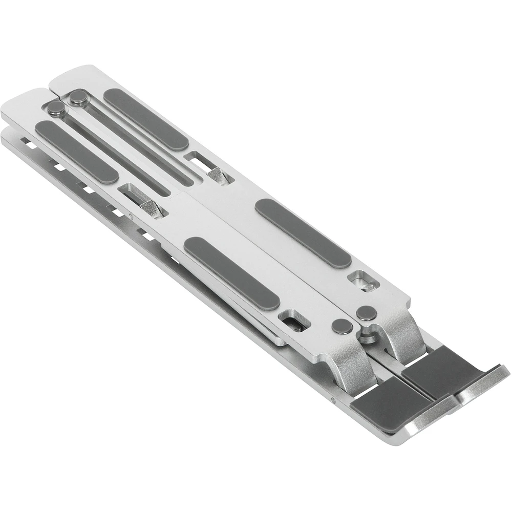Reduce neck and eye strain with the Portable Ergonomic Laptop/Tablet Stand that puts your device in an optimal position for daily work. The adjustable design supports six different height options to deliver a comfortable angle for nearly any environment. The stand is made of high-quality aluminum with high heat reduction to help prevent your device from overheating. Compact and lightweight, the stand folds flat for easy storage. Bonus pouch included for convenient carrying.