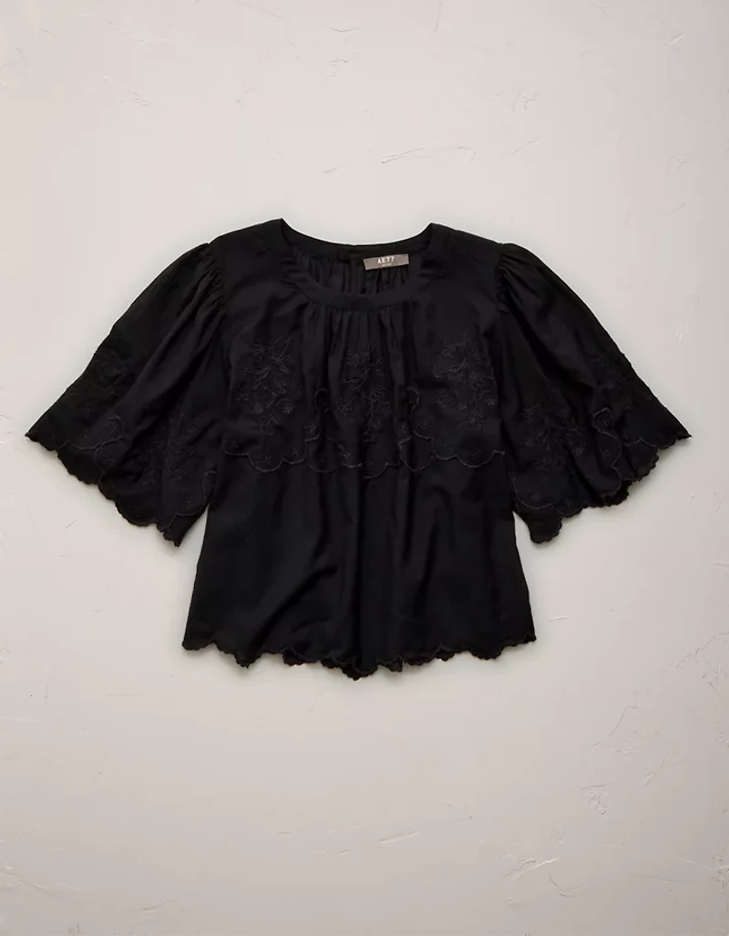 This voile t-shirt is lightweight and airy with embroidered details and femme lace trim.