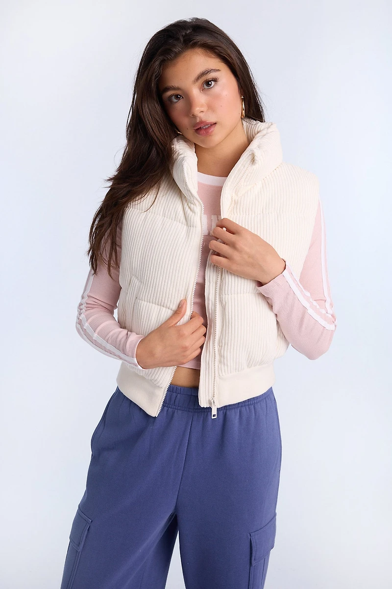 Woven outerwear vest. Quilted filling in a lightweight fabric. Sleeveless with 2 pockets. Available in solid colours. Cropped fit with a zipped front. Available in a cozy sherpa fabric and in a soft and sleek vegan leather.