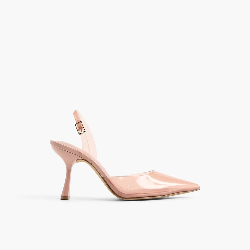 Aeryss in pink is playful sophistication. Featuring a translucent pink upper, matching heel & slingback, and a streamlined silhouette, she feels light, modern and just unexpected enough. The soft tone keeps it feminine, while the clear detailing adds a contemporary edge. A fresh pop for events, parties or summer nights out.