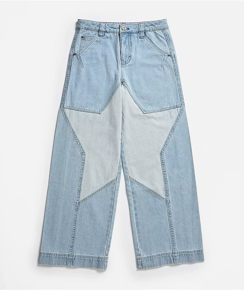 Offered in children's sizes, A.LAB delivers the Mega Star Rave jeans in a light blue denim construction with an ultra-wide leg, baggy fit for a throwback Y2K style. Showcasing a giant star design stitched on the front using reinforced knee panels, th