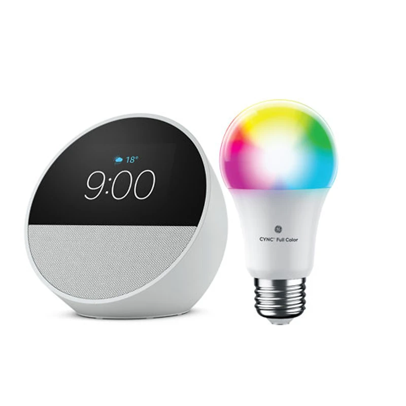 Enhance your smart home with this smart alarm clock and smart light bulb bundle. Check the time, weather updates, and song titles at a glance with the Amazon Echo Spot smart alarm clock featuring Alexa. Plus, you get the GE Cync A19 Smart LED light bulb with Matter compatibility. Access lighting control away from home through the Cync app, without the need for a hub or bridge