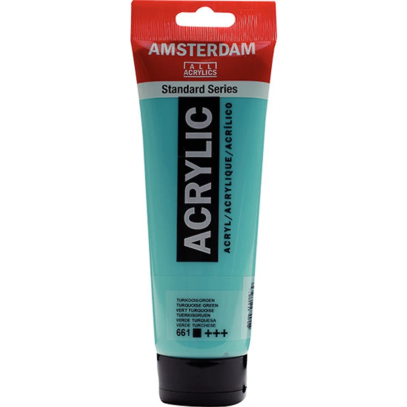 Amsterdam Standard Series Acrylics come in a wide selection of pure, brilliant colours, skillfully made with 100% acrylic emulsion and high-quality pigments. Offering excellent lightfastness and multiple opacities, Amsterdam Acrylics adhere well to canvas and walls, as well as to many other non-greasy surfaces: paper, cardboard, wood, plywood, concrete, chipboard, plaster, etc. Special metallic, pearlescent and reflex colours complete the balanced palette of this medium viscosity paint. Plus, they're an eco-friendly choice. Containers are made of plastic and are entirely recyclable. None of the pigments contain heavy metals. Discover the endless creative possibilities of Amsterdam Acrylics!