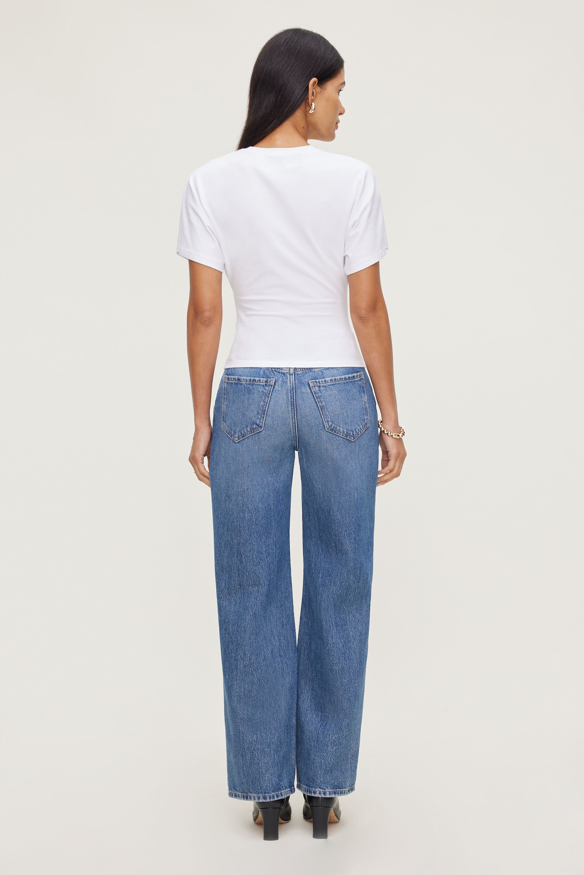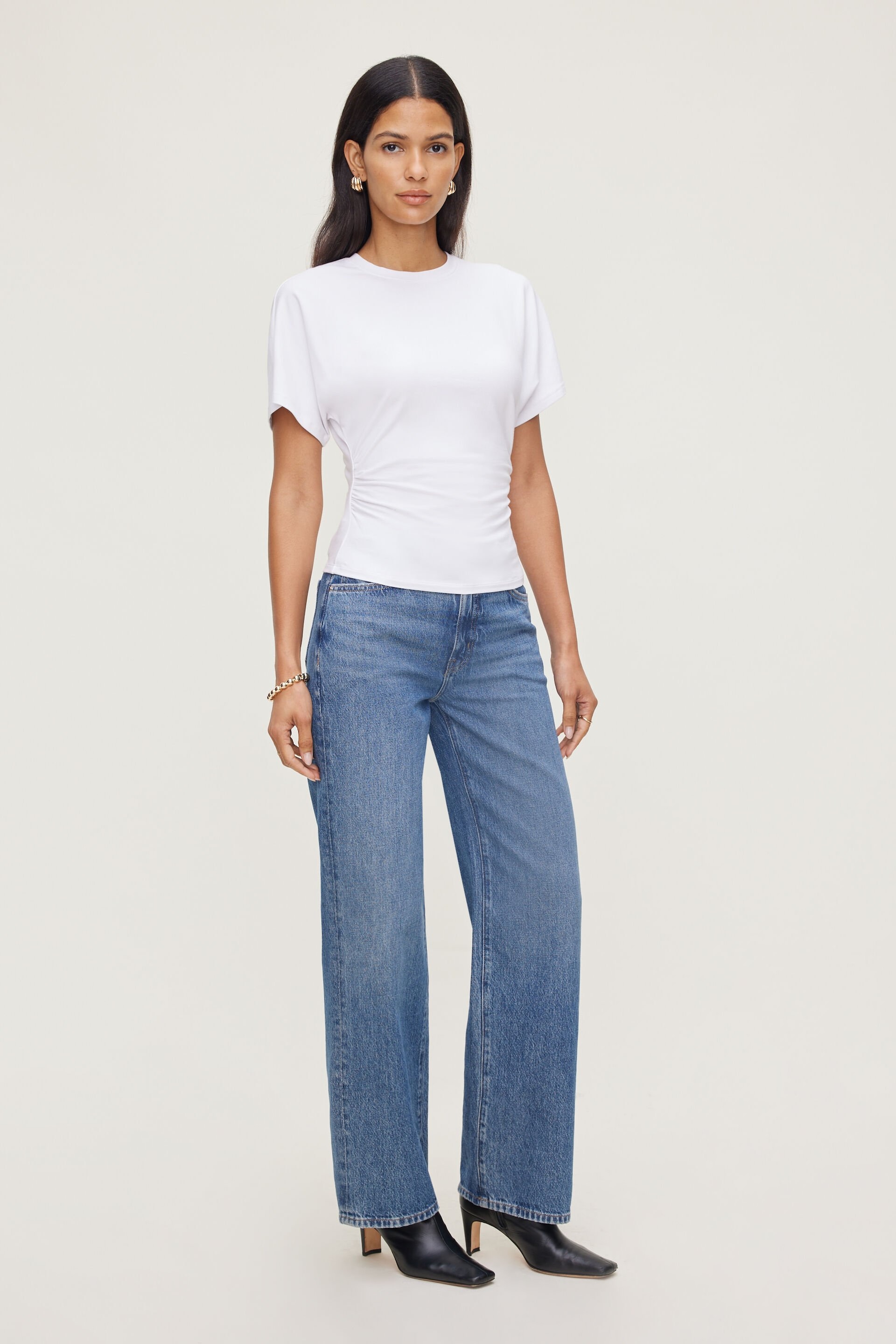 This T shirt is made from our heavy cotton spandex blend fabric, crafted with a comfortable stretch that holds its shape for a soft, body-hugging feel. It's designed for a fitted silhouette with dolman sleeves for some loose flare. Style it with