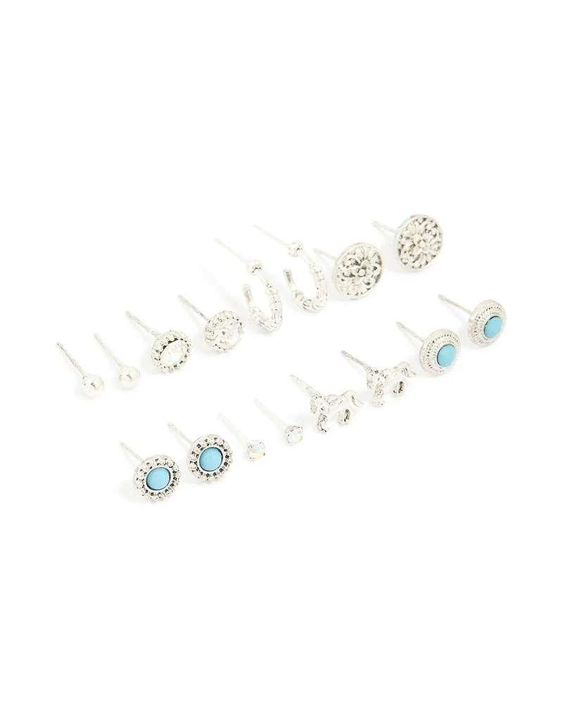 Level up your ear game with this Antique Silver Turquoise Stone & Unicorn Stud Earrings Pack. This fun earring set includes ball studs, diamante stud earrings, open bamboo hoops, etched floral studs, turquoise stone studs, iridescent diamante studs, unicorn stud earrings and ribbed antique silver-look studs. Perfect for mixing and matching, this ear pack goes with everything from jeans and a tee to a cute dress. Wear them to festivals, parties, or every day when you want your jewellery to feel a little bit magical. Material: Turquoise Colour: Silver, Blue Dimensions: Smallest Earring Length 3 mm x Smallest Earring Width 3 mm