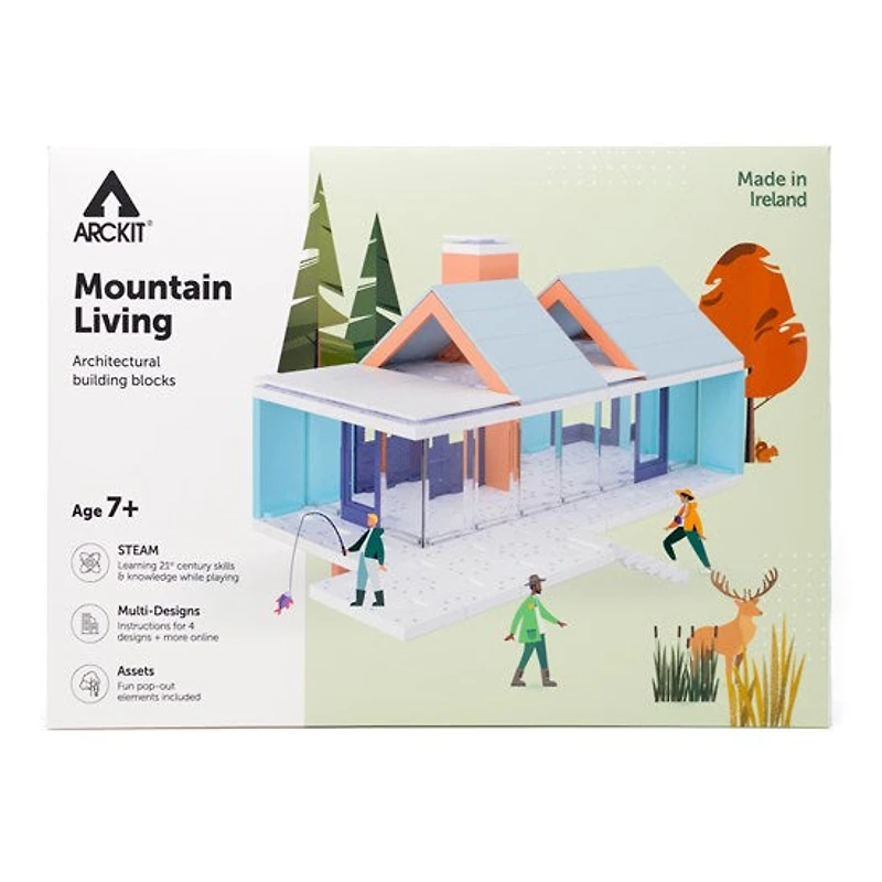 Budding architects ages 7 and up can enjoy learning about life in the mountains by building this colourful and modern alpine house. From figurines to trees and animals, a host of bespoke cardboard pop-outs are included in the Mountain Living Kit to bring storytelling, scenery and scale to model designs. Plus, all Acrkit construction kits are compatible with one another—perfect for collectors! Scale 1:50 / ¼.In Arckit’s commitment to helping improve the environment, all new kits contain 100% plastic-free packaging, and instead, use compostable material made from potato and corn starch. In addition, the Mountain Living Kit has a reusable box for storing components.Includes: