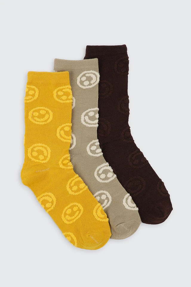 Ardene 3-Pack Smiley Face Crew Socks in Yellow | Polyester/Spandex