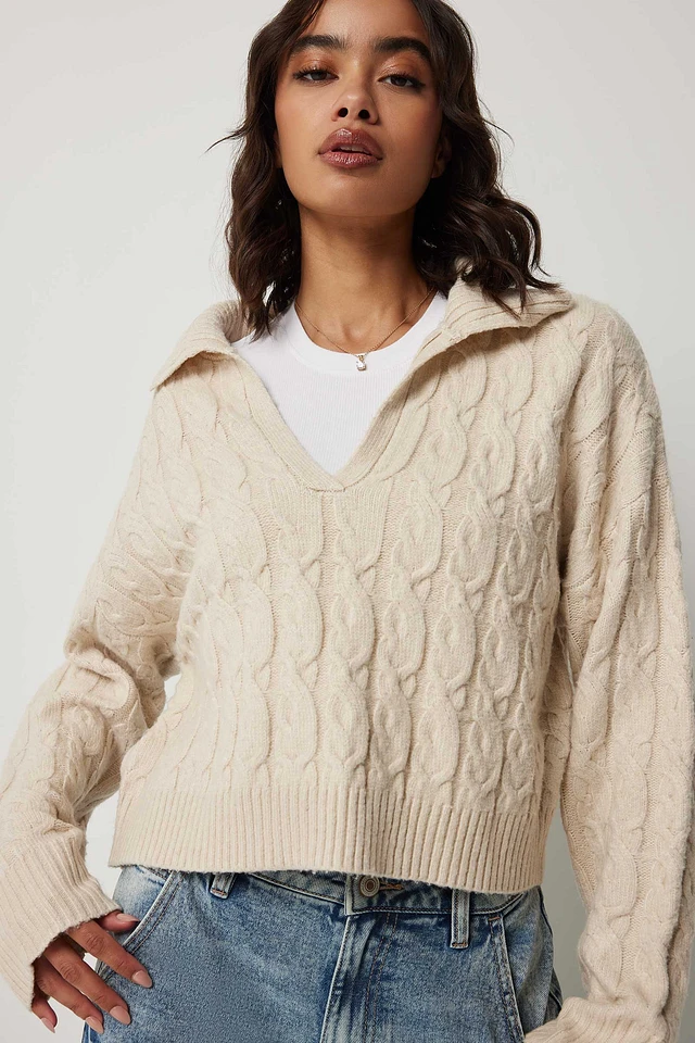 Ardene Cable Knit Johnny Collar Sweater in Beige | Size Large | Polyester | Eco-Conscious