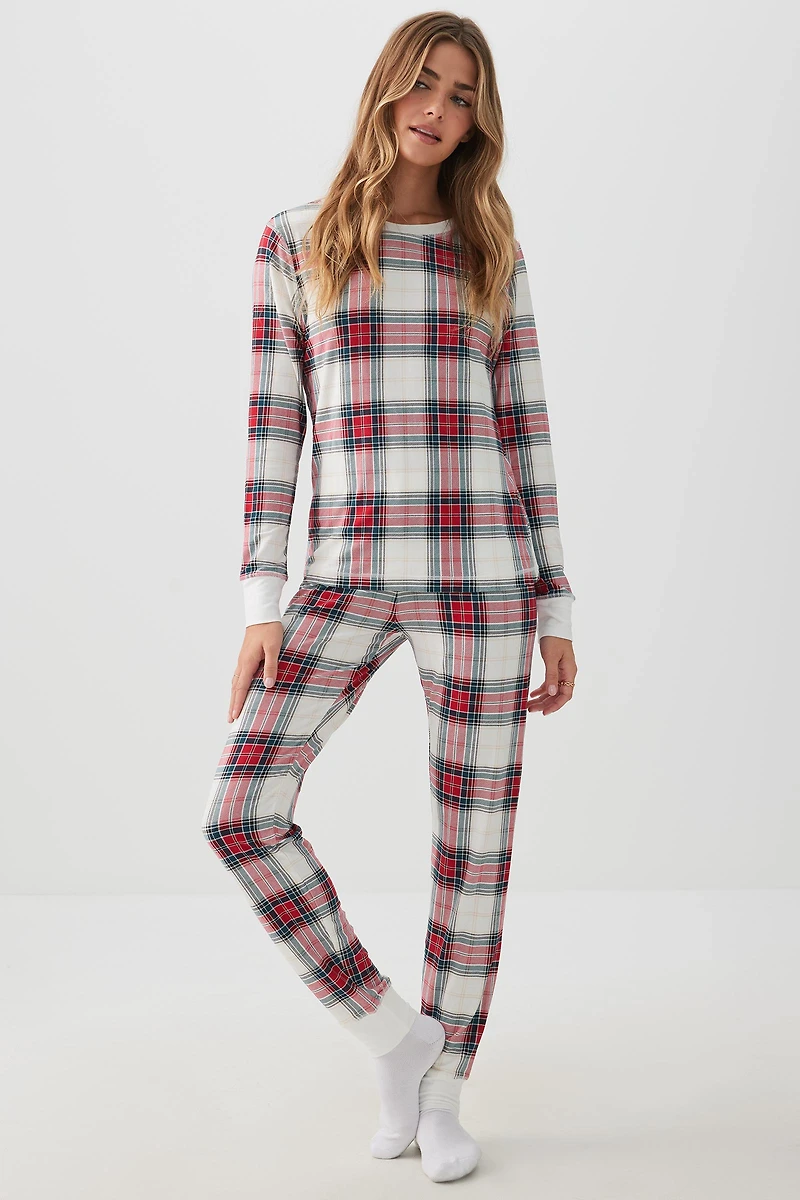 Eco-conscious holiday pyjama set. Wrapped and ready to go! HUSHKNIT ?? Lightweight, softly brushed & feels like a gentle whisper Long-sleeve top Skinny joggers Choice of festive prints 92% recycled polyester, 8% elastane Model is wearing size S | Ardene HUSHKNIT Skinny Jogger PJ Set in White | Size XS | Polyester/Elastane | Eco-Conscious