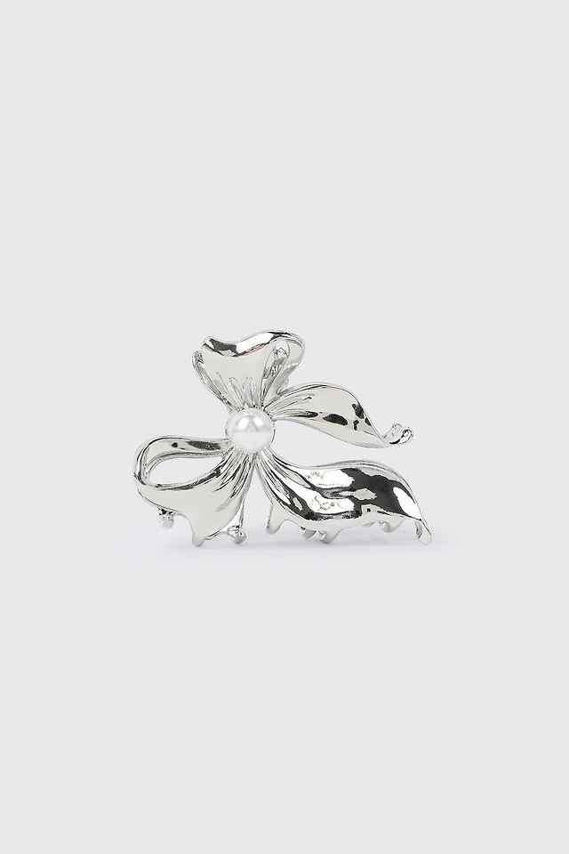 Ardene Metallic Bow Shaped Hair Claw with Pearl in Silver