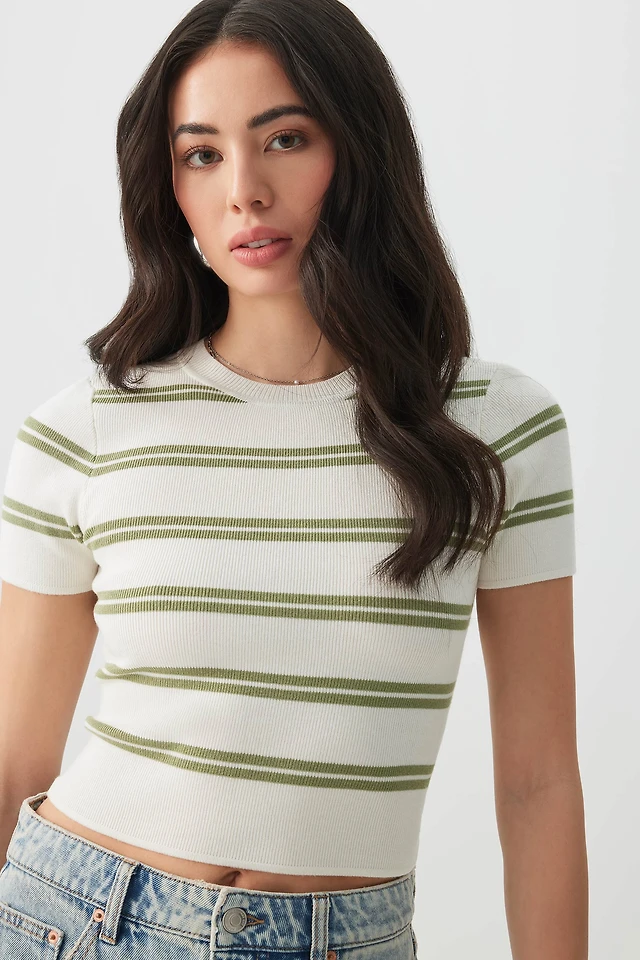 Ardene Striped Ultra Crop Short Sleeve Sweater in Sage | Size XS | Nylon/Viscose