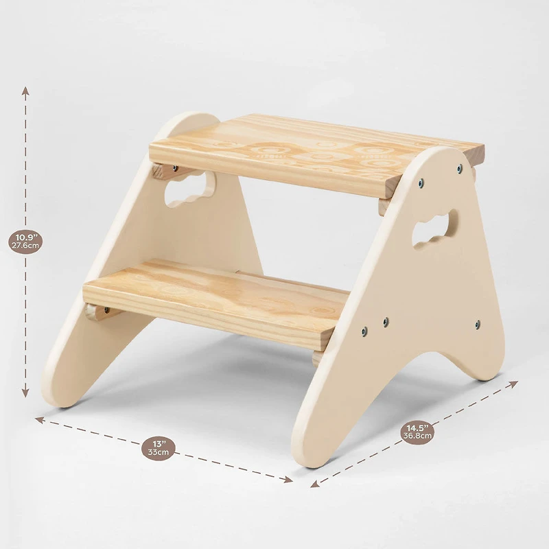 Kids Furniture: Ivory colored two-step stool for kids. Safe & Sturdy: Wide wooden steps and a solid construction. Easy Assembly: Hex wrench included for quick assembly! Portable: Use the handy handles to grab it on-the-go! Dimensions: This step stool measures approximately 13" (W) x 14.5" (D) x 10.9" (H). Age: Recommended for toddlers 2 years +