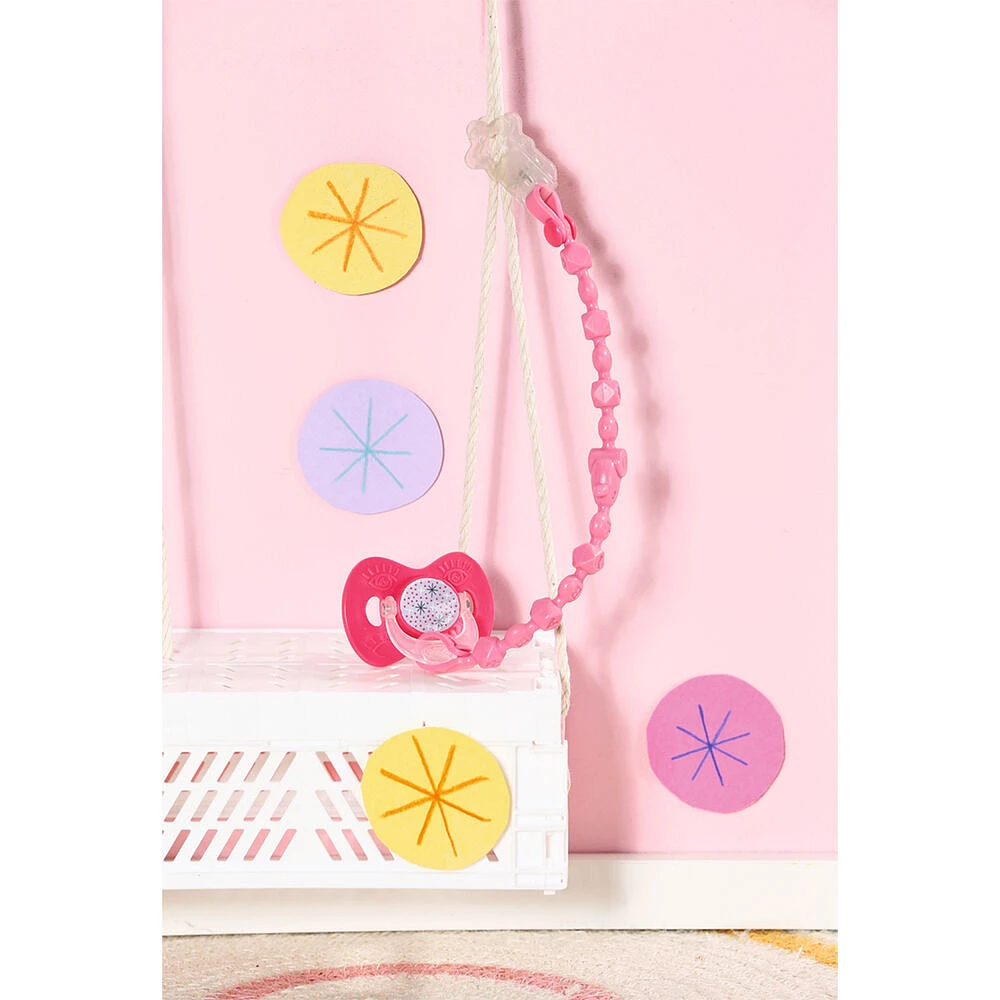 The dummy fits all BABY born 43 cm dolls. The eye function with the dummy only works with BABY born Magic. 2 assorted designs, only 1 dummy supplied. Suitable for children aged 3+. Doll not included. It's BABY born's favourite accessory! An essential for any BABY born fan, the Magic Dummy is perfect for soothing BABY born Magic. What's extra special about this dummy is how it controls the eyes of any BABY born Magic doll. Little ones can simply put it in BABY born Magic's mouth and twist one way to close the eyes so they're asleep, and then twist the other way to wake them up! Doll parents will love to be in control of when their BABY born is awake or snoozing soundly. The Magic Dummies also come on chains that can be clipped onto BABY born Magic's clothes so they never lose it! With dummies available in either pink or orange, and dummy chains available in either silver or pink, little ones can create their favourite accessory to soothe their favourite doll. This accessory is suitable for children aged from three and fits BABY born Magic Dolls 43cm. Designed to enhance and create long-lasting fun through imaginative play with dolls.High-quality accessories for the BABY born branded doll.