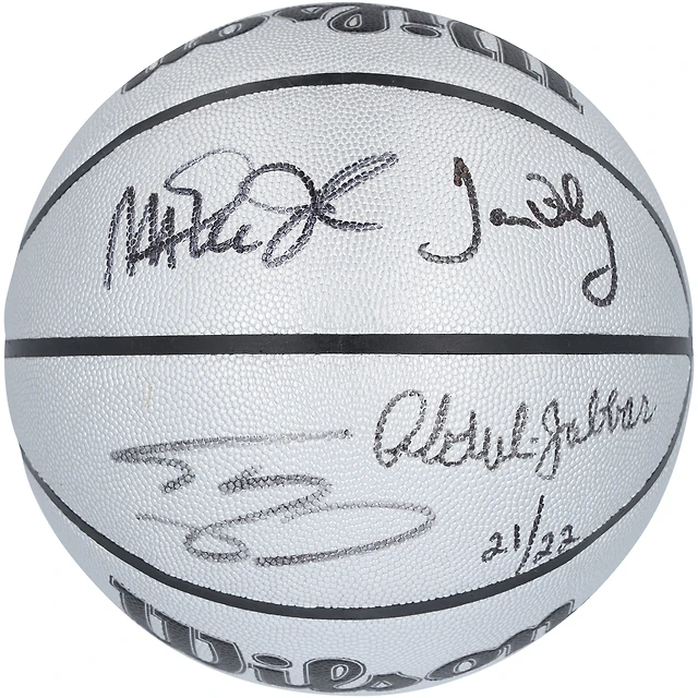Ballon de basket-ball en platine dédicacé par Magic Johnson, Kareem Abdul-Jabbar, Shaquille O'Neal et James Worthy des Los Angeles Lakers pour le 75e anniversaire du logo Wilson - Édition limitée à 22 exemplaires