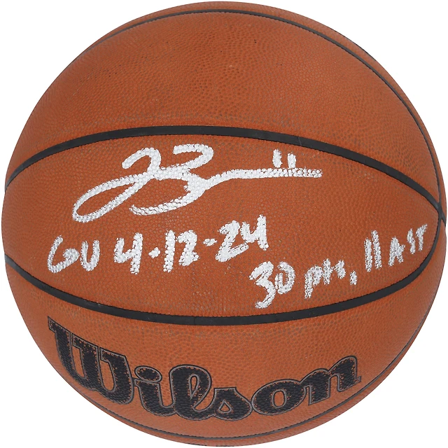 Ballon de basket dédicacé par Jalen Brunson, des New York Knicks, lors du match contre les Brooklyn Nets le 12 avril 2024, avec plusieurs inscriptions.