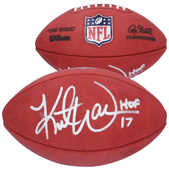 Ballon de football Duke en couleur autographié par Kurt Warner des Rams de St. Louis avec l'inscription « HOF 17 »