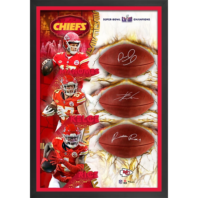 Ballon de football Duke Three Shadowbox dédicacé par Patrick Mahomes, Travis Kelce et Rashee Rice, champions du Super Bowl LVIII, Kansas City Chiefs