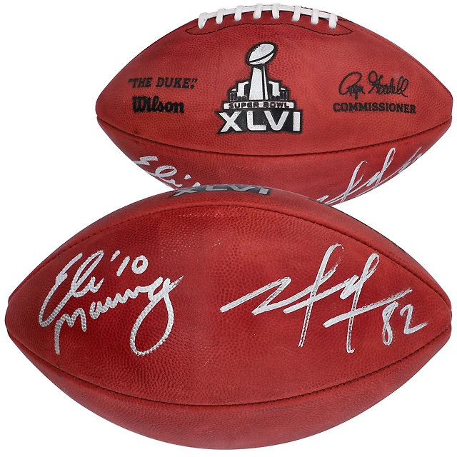 Ballon de football professionnel Wilson Super Bowl XLVI autographié par Eli Manning et Mario Manningham des New York Giants