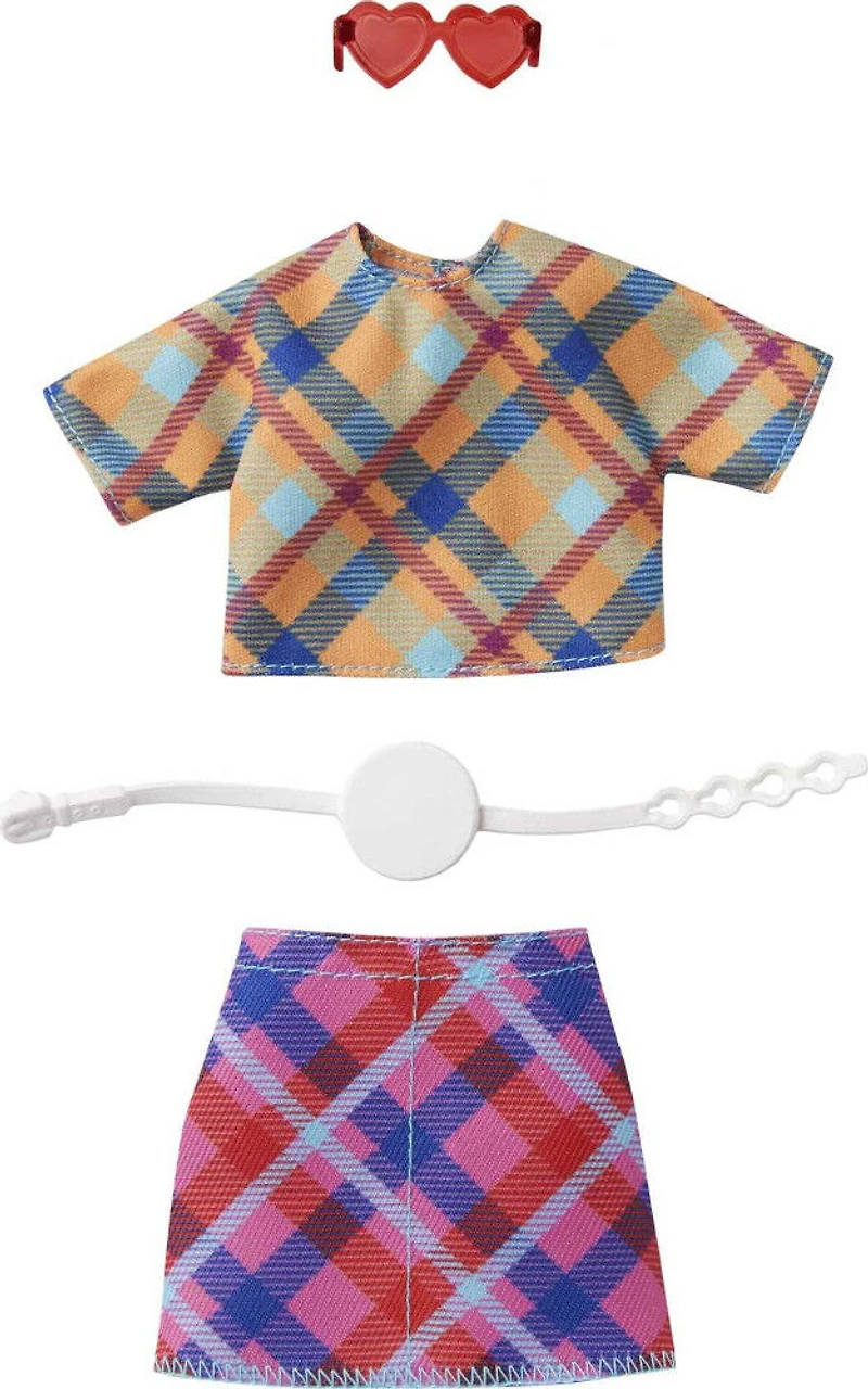 This bold and playful outfit features a multi-colored plaid crop top and mini skirt accented with a white fanny pack and heart-shaped sunglasses.