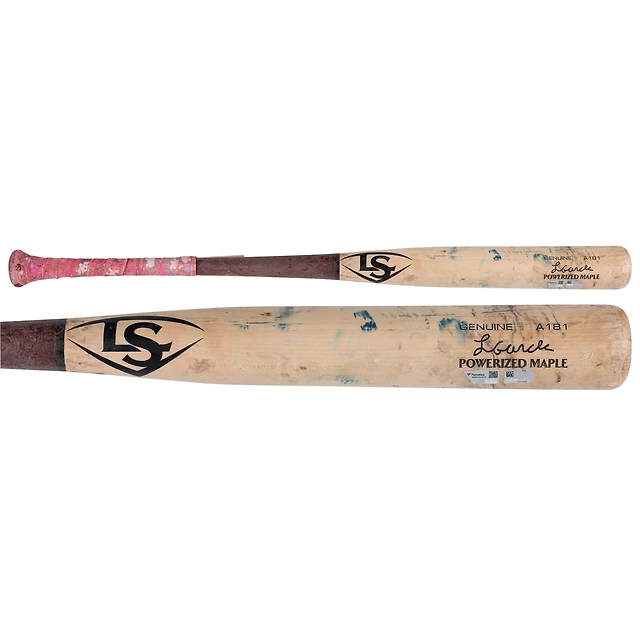 Batte cassée beige/rouge des Louisville Slugger de Luis García Jr., utilisée par les Nationals de Washington, lors du match contre les Brewers de Milwaukee, le 12 juillet 2025