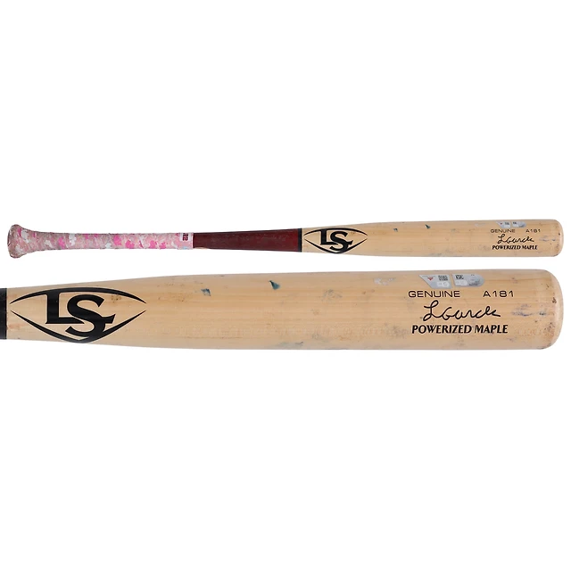 Batte cassée beige/rouge des Louisville Slugger de Luis García Jr., utilisée par les Nationals de Washington, lors du match contre les Pirates de Pittsburgh, le 16 avril 2025