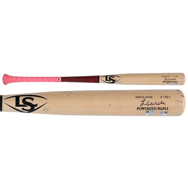 Batte cassée des Louisville Slugger beige/rouge de Luis García Jr., utilisée par les Nationals de Washington, lors du match contre les Dodgers de Los Angeles, le 7 avril 2025
