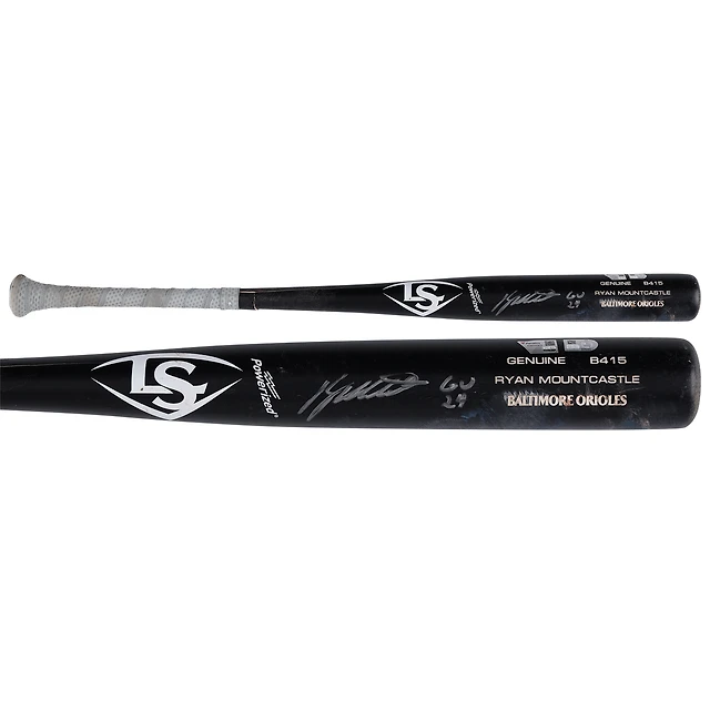 Batte dédicacée par Ryan Mountcastle des Baltimore Orioles, Black Louisville Slugger, utilisée lors du match contre les Texas Rangers le 27 juin 2024, avec l'inscription « GU 24 »