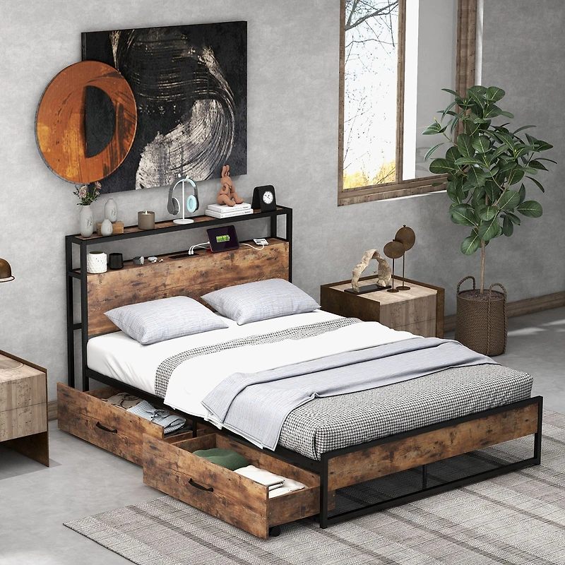 Bed Frame with 2-Tier Storage Headboard and Charging Station-Full Size