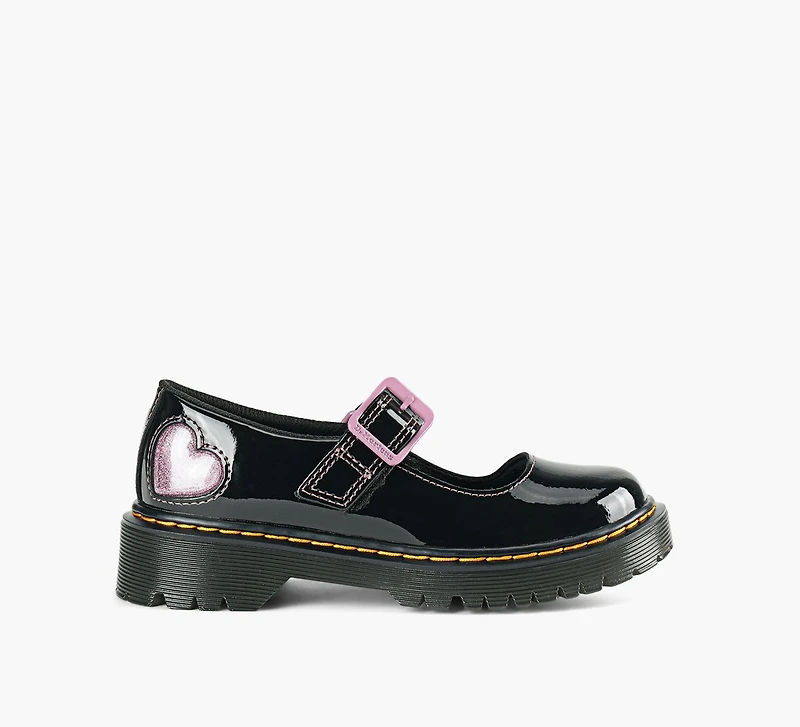 A classic with attitude, the Dr. Martens Bex gives the iconic Mary Jane a bold, kid‑ready upgrade. Built from smooth, durable leather with a naturally shiny finish, it’s set on the chunky Bex sole that brings an instant boost of confidence and unmistakable DM energy. A simple buckle strap keeps the fit secure, while the flexible construction and cushioned AirWair outsole are made to move with growing feet. Finished with the brand’s signature yellow welt stitching and heel loop, it’s a school‑to‑weekend staple that lets kids stand out, stay comfortable, and stomp through their day in true Dr. Martens style.