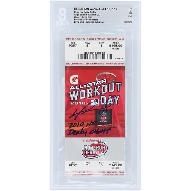 Billet NM 7 authentifié et autographié par David Ortiz des Boston Red Sox, signé Beckett Fanatics, daté du 12 juillet 2010, avec l'inscription « 2010 HR Derby Champ »