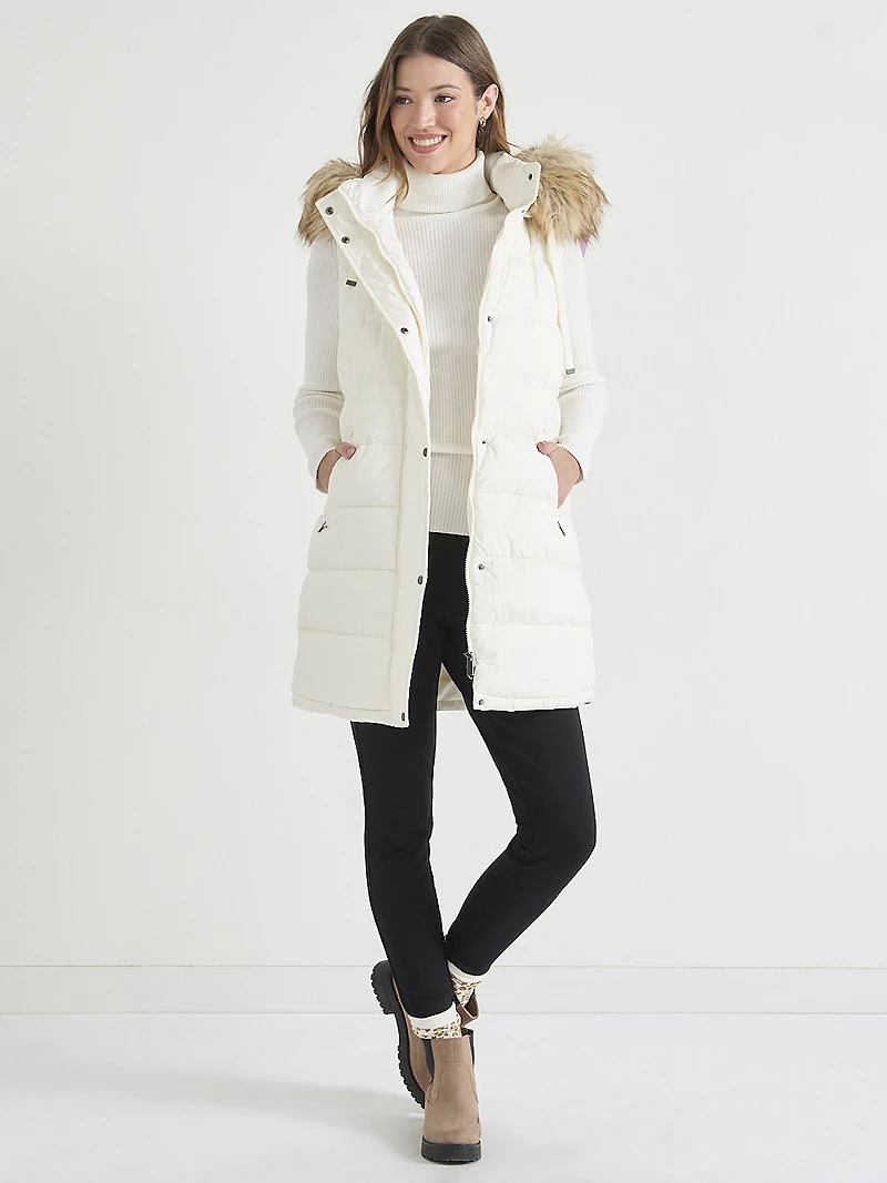 Introducing the Carlyn Long Puffer Vest with Detachable Hood & Fur Trim - it's the perfect cozy and chic option for those early winter and spring days, keeping you warm and looking fabulous as you embrace the changing seasons.