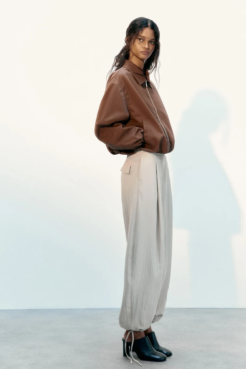 Oversized jacket in twill. Collar, zipper at front, and welt side pockets. Elastic at cuffs and hem for a puffy silhouette. Lined.