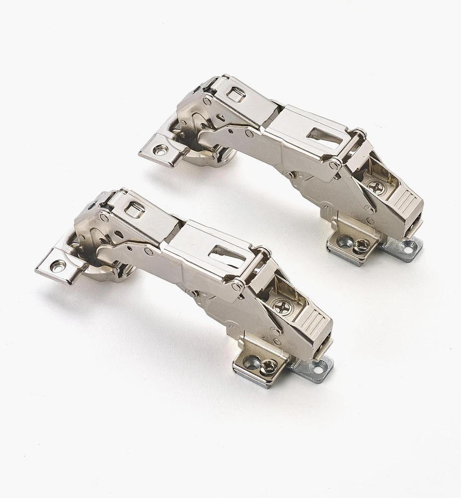 These Blum hinges set the standard for European-style hinges. Not only are they easy to quickly install, but they remain hidden when the door is closed. Hinges are spring-loaded with two rest positions, fully open or fully closed. They are nickel plated for a clean, rust-proof finish.