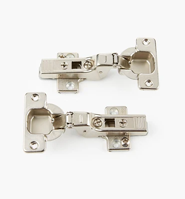 These Blum hinges set the standard for European-style hinges. Not only are they easy to quickly install, but they remain hidden when the door is closed. Hinges are spring-loaded with two rest positions, fully open or fully closed. They are nickel plated for a clean, rust-proof finish.