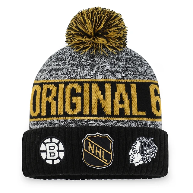 Bonnet en tricot à revers avec logo NHL Original 6 Script Fanatics gris chiné pour hommes avec pompon