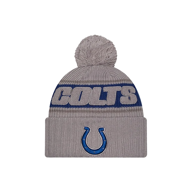 Bonnet en tricot à revers avec pompon Indianapolis Colts 2024 Sideline Sport New Era gris pour homme