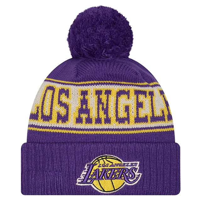 Bonnet en tricot à revers rétro Los Angeles Lakers violet New Era pour homme avec pompon