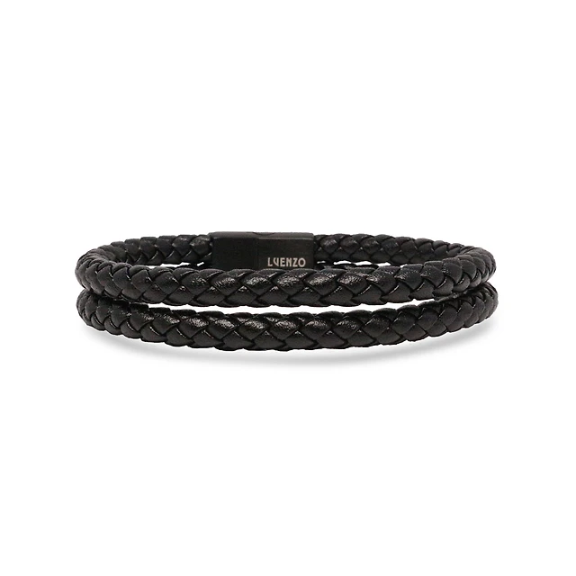 Bracelet doublé en cuir véritable noir mat par Luenzo