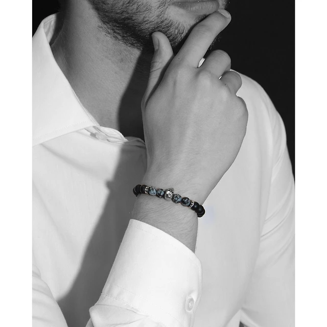 Bracelet onyx noir et flocon de neige avec accent crâne argenté par Luenzo