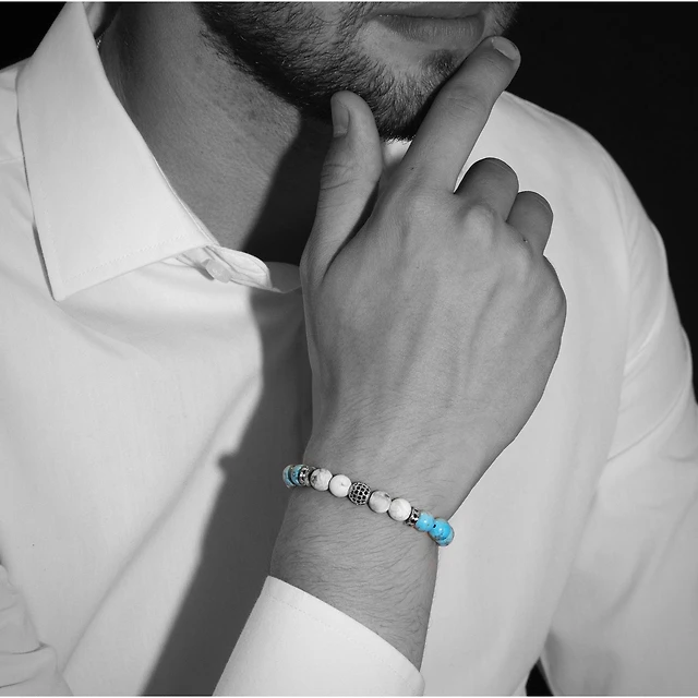 Bracelet turquoise bleue et blanche avec accent de zircone cubique argenté par Luenzo
