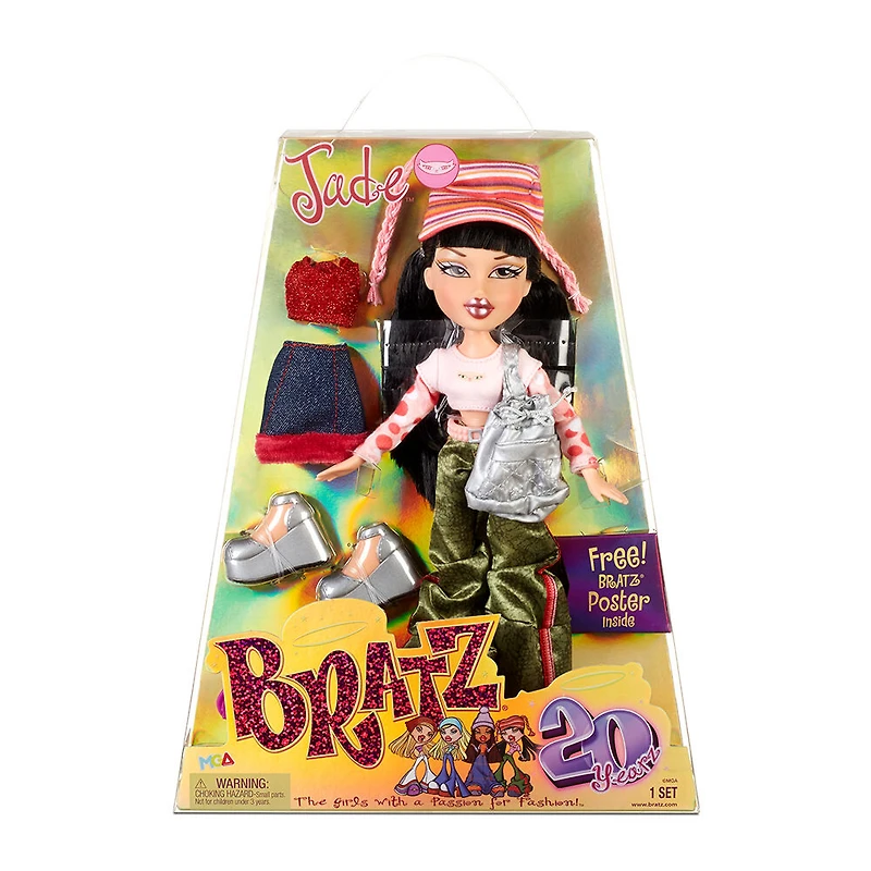 20 YEARZ SPECIAL EDITION: In celebration of Bratz turning 20 yearz old, collect these special edition fashion dolls in gorgeous foil packaging, featuring a 20 yearz motif and collectible holographic poster FAN FAVE RERELEASE: A near exact replica of the dolls that started it all in 2001. Collect the iconic debut looks of the Bratz Pack! SUPER STYLIN' FASHIONS: Jade includes 2 outfits for tons of mix 'n' match possibilities! Her fashion passion is clothes that are extreme and far out! INCLUDES: 1 Bratz 20 Yearz Special Edition Original Fashion Doll, fashions, shoes, accessories, bag, hair brush, and poster #TBT when the Bratz made their super stylin' debut in 2001! 20 years later, you can collect replicas of the original 4 girls. Collectors and new Bratz fans can celebrate 20 years of the Girls with a Passion for Fashion with these iconic looks. From the sizzlin' outfits to the trapezoid packaging, they're near exact replicas of the dolls that started it all. Now in special edition holographic packaging! Each doll includes 2 fierce outfits for tons of mix 'n' match looks, 2 pairs of shoes, a bag, and headband or hat. In addition to their fab looks, each doll also includes a hairbrush and holographic poster. Jade's fashion passion is clothes that are extreme and far out! Her friends call her "Kool Kat" because she loves cats - and she's cool!
